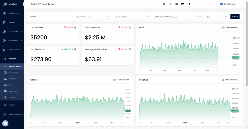 WebJoint's sales and tax reports display graphs of a delivery service's revenue, orders, refunds, profit, and orders by source via their website other sources. There are also a number of export options with these reports, such as the ability to export sales by product, variant, package, delivery zone, staff, order summary report, and tax report. For tracking trends and pinpointing opportunities for development and improvement, this data is essential.