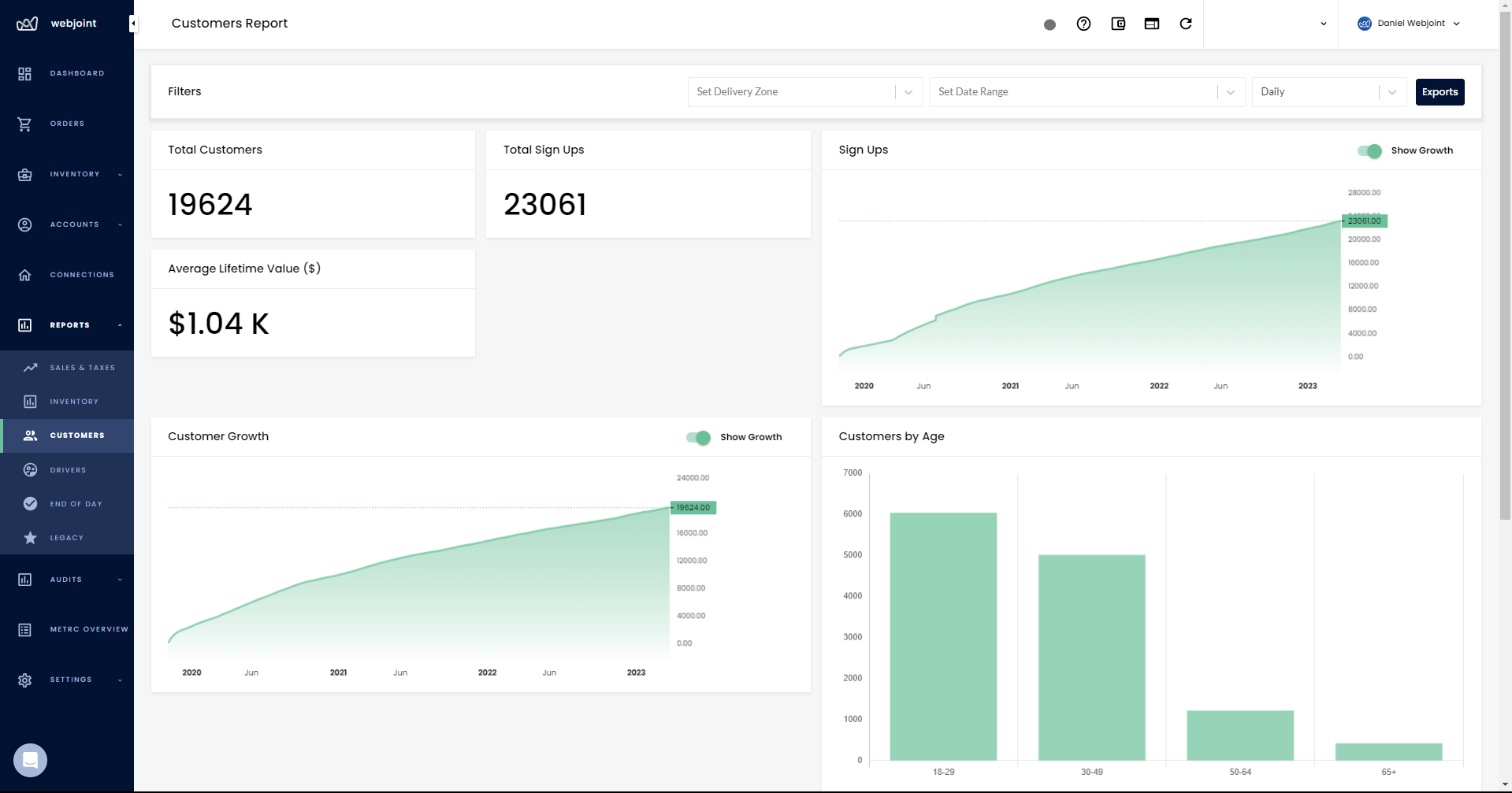 WebJoint's Customer Analytics reports provide businesses with graphs that show signups, customer growth, customers by age, customers by gender, and first-time versus returning customer reports. This information is essential for businesses to understand their customer demographics and tailor their marketing efforts to meet their customer's needs. All of the customer data can be exported into a spreadsheet file, and businesses can also export a lifetime value report.